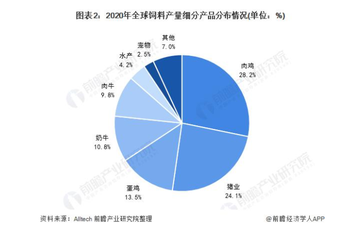 In terms of feed types, the global feed output of broiler chickens in 2020 reached 335 million tons, accounting for 28.2% of the global feed output. The feed production of pig industry was 286 million tons, accounting for 24.1% of global feed production. The feed output of laying hens, dairy cows and beef cattle was 160 million tons, 129 million tons and 116 million tons, accounting for 13.5%, 10.8% and 9.8%, respectively. Pet feed accounts for 2.5 percent of global feed production.