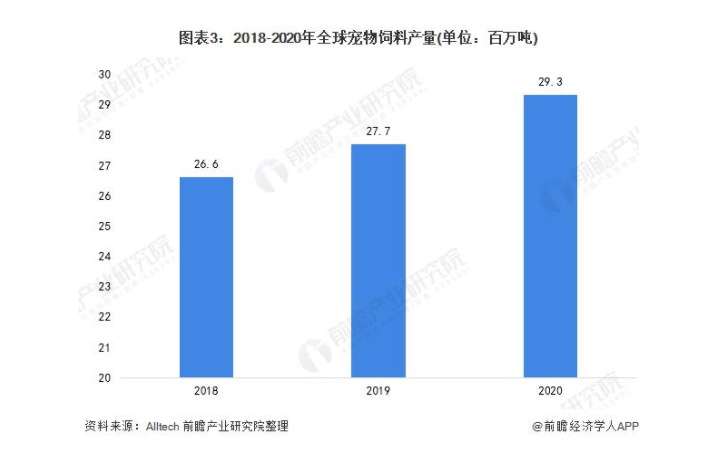 Although the pet feed in the global feed production accounted for a small proportion, but with the pet hot, pet food development, in recent years the pet feed production all the way up. In 2018, global pet feed production was 266 million tons, and by 2020, it will grow to 29.3 million tons.