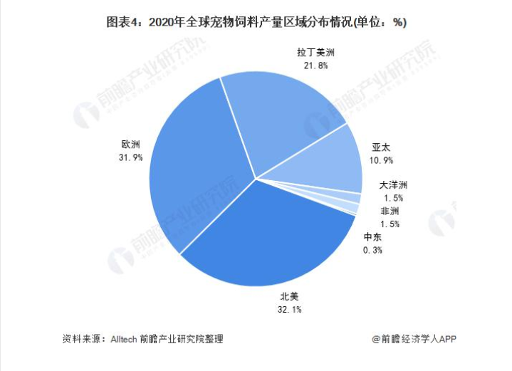 In the global pet feed production, Europe and the United States have a bright performance. In 2020, the output of pet feed in North America was 9.41 million tons, accounting for 32.1% of the total. The output of pet feed in Europe was 9.36 million tons, accounting for 31.9% of the whole. Latin America and Asia Pacific account for 21.8% and 10.9% of global pet feed production, respectively. Europe and the United States account for 60% of the world's pet feed production.