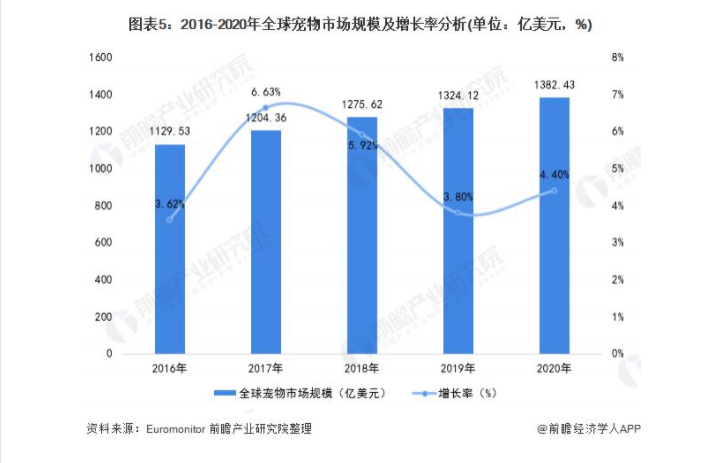 The global pet market is mainly composed of pet food, pet products and other pet food. According to Euromonitor data, the scale of the global pet market increased year by year from 2016 to 2020. The global pet market reached 138.243 billion US dollars in 2020, an increase of 4.40% compared with 2019.
