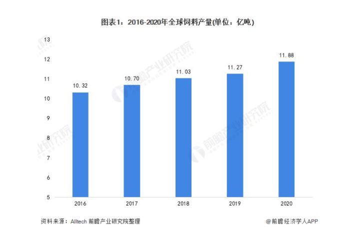 根據(jù) Alltech 對全球飼料的調(diào)查顯示,2016-2020 年,全球飼料產(chǎn)量逐年增長,2020 年雖然遭受疫情的影響,但全球飼料產(chǎn)量仍然增長 1%,達 11.88 億噸。